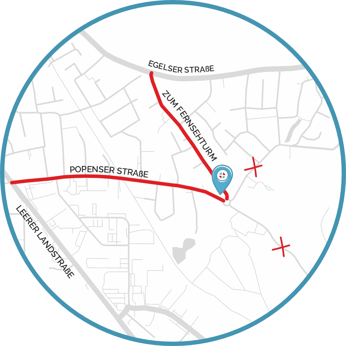 Sie können uns in der Zwischenzeit über die Popenser Str. und Zum Fernsehturm erreichen.